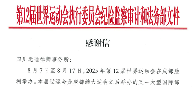 运逵·头条 本所获成都世运会执委会感谢信