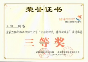 11月9日,在锦江律师文化节辩论赛中,本所王佩律师荣获三等奖。