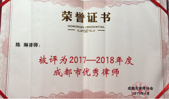 会上公布了50家“优秀律师事务所”、100名“优秀律师”和120名“优质服务蓉城30周年律师”名单。本所陈琳、金璨律师荣获“2017—2018年度成都市优秀律师”荣誉称号。